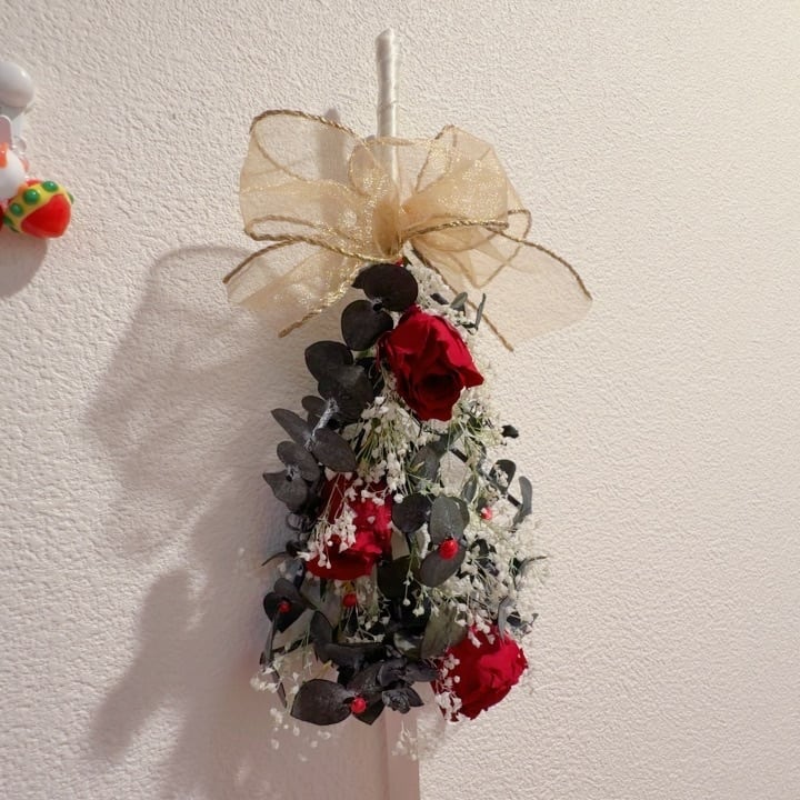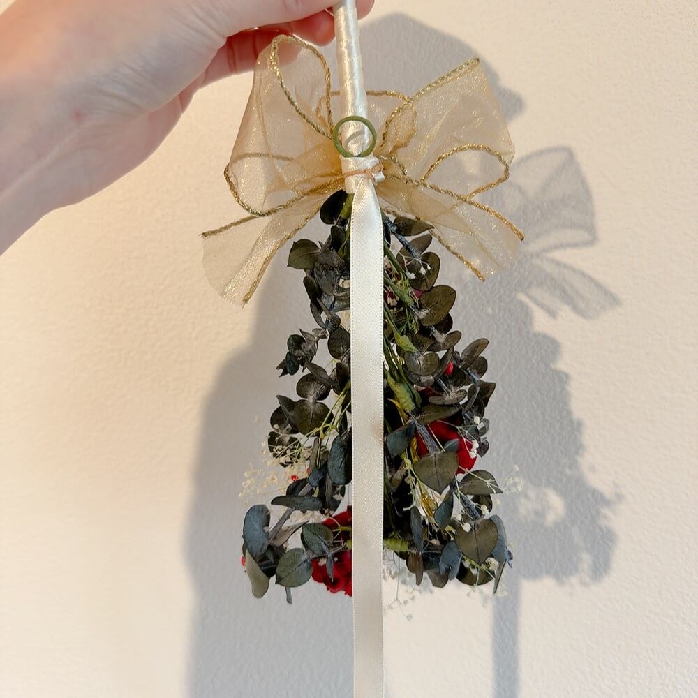 深紅のローズを中心に、ユーカリとカスミソウを合わせた 大人のためのツリーエアリー。